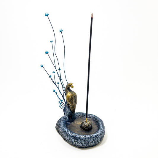 A curated set of one-of-a-kind incense holders sculpted by hand. Each piece blends functional design with surreal organic forms—birds, fungi, stone textures, and metallic patinas. Designed to hold standard incense sticks.