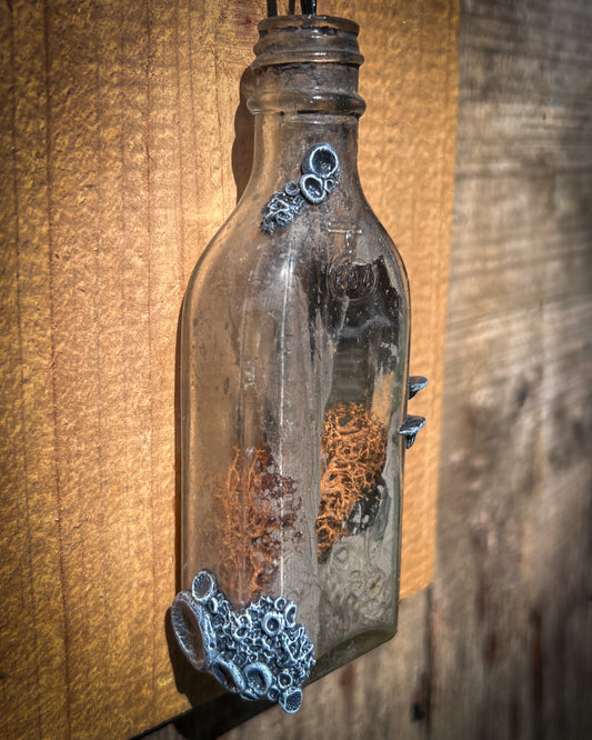 One-of-a-kind sculptures created from reclaimed bottles and bones found at Dead Horse Bay in Brooklyn. Each piece is transformed with hand-sculpted fungi, metallic textures, moss, and minerals — merging history with surreal organic growth.