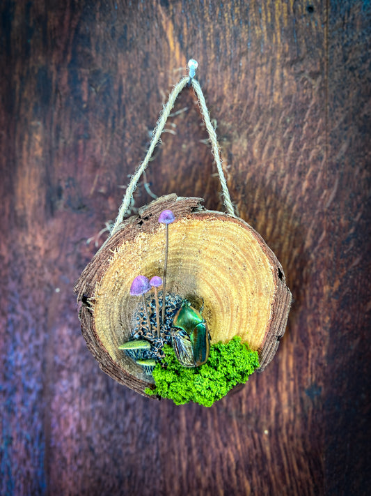 Spores & Remains is a series of small works built from what’s left behind — beetles, bones, wood, and fragments of the natural world. Each piece blends preserved insects, hand-sculpted fungi, and moss