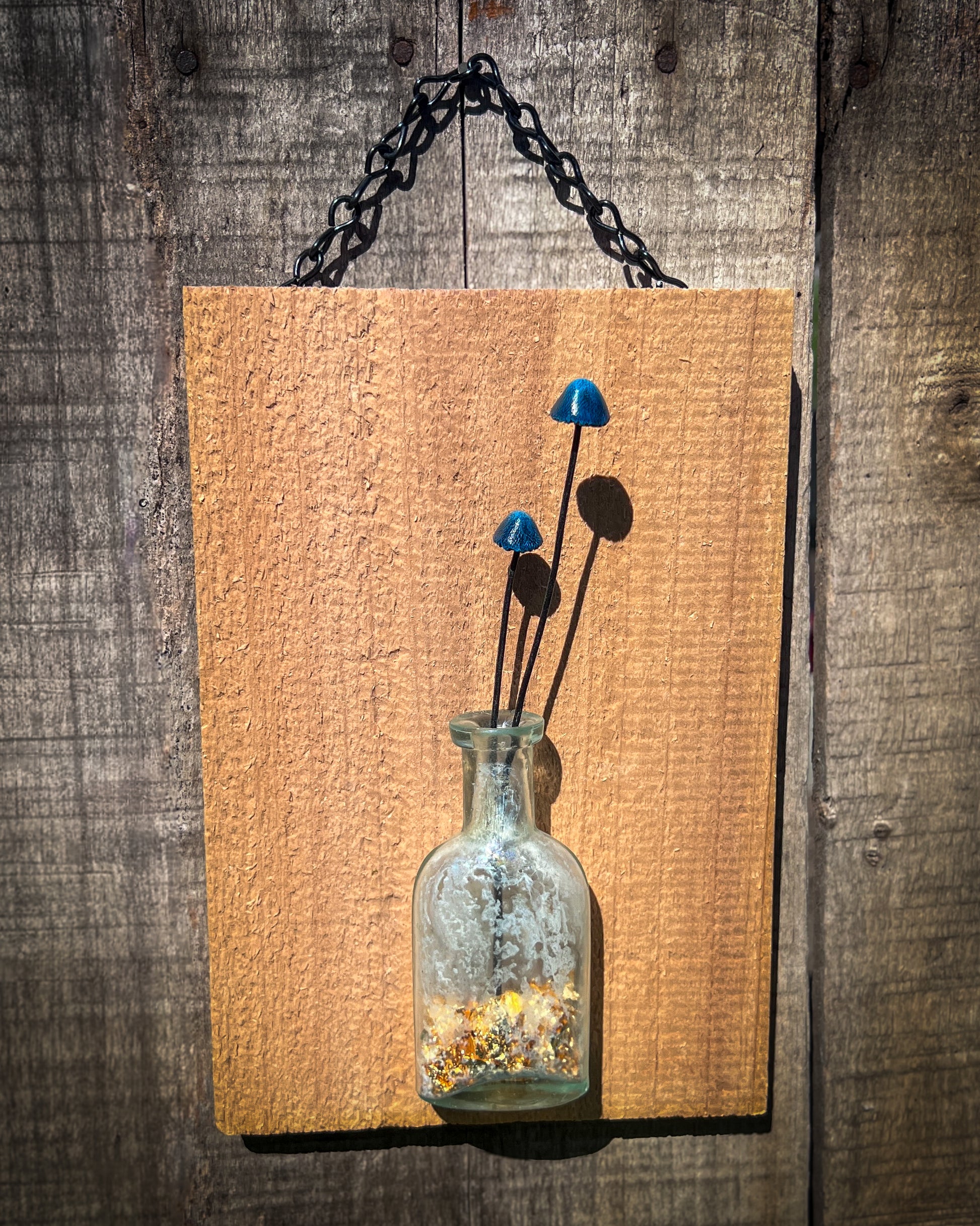 A reclaimed clear glass bottle from Dead Horse Bay, Brooklyn — an uncapped pre-plastic landfill dating back to the 18th century. The bottle is mounted on a rough-cut wooden backer with a metal chain for hanging. Hand-sculpted blue mushrooms rise from the bottle’s mouth above a base of preserved moss and mineral fragments.