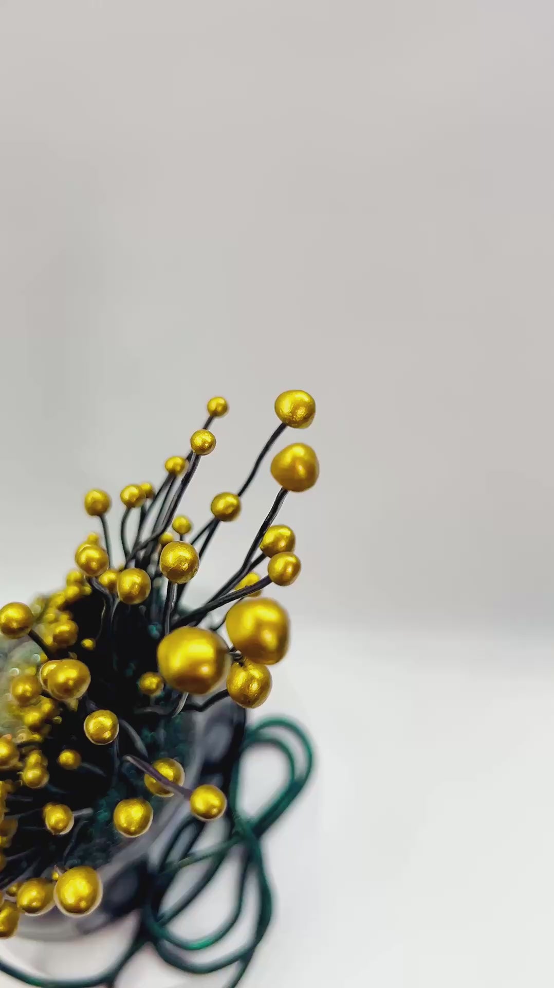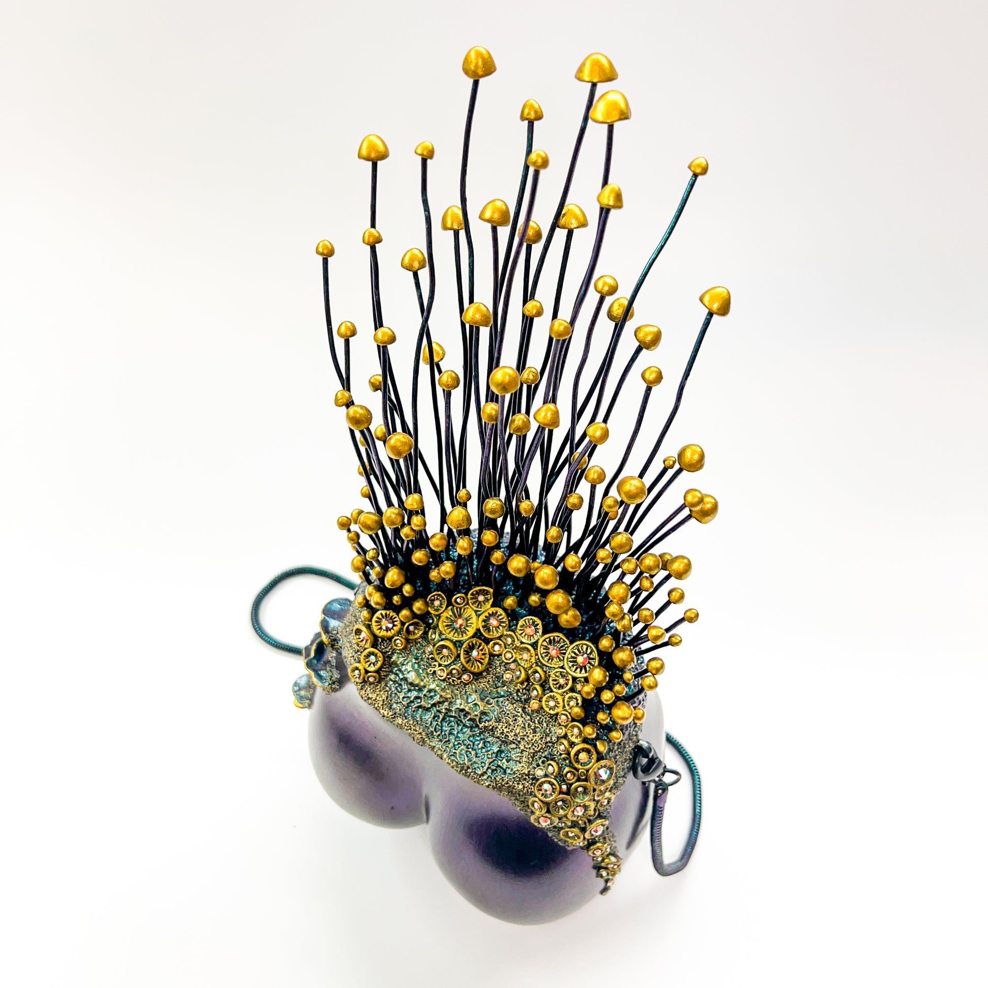 - Mixed media sculpture (reclaimed clutch base, sculpted fungi, glass rhinestones, metallic finishes)