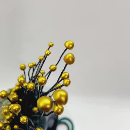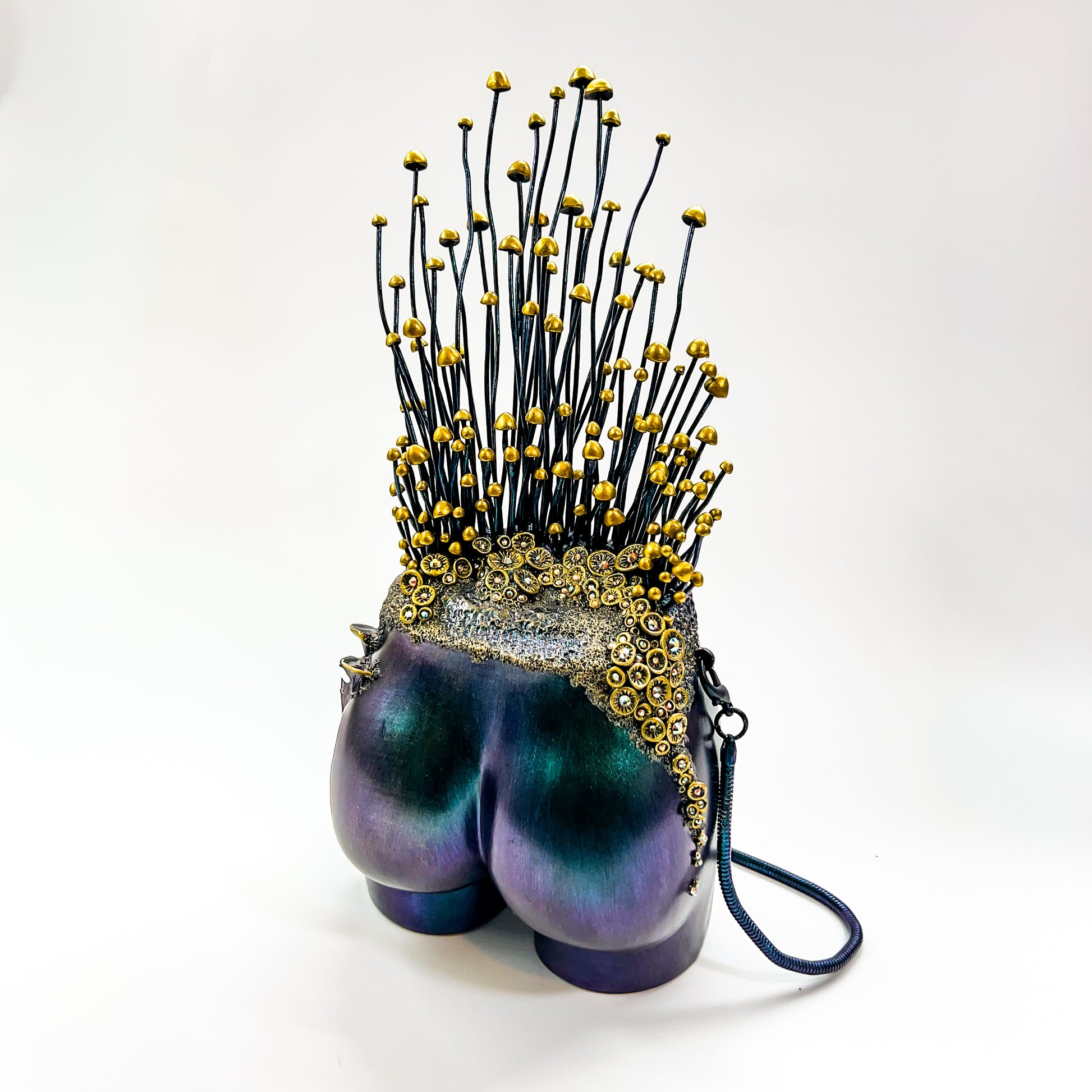 A reclaimed butt-shaped clutch transformed into a surreal sculptural art piece. Hand-sculpted spores, gold mushrooms, glass rhinestones, and color-shifting metallics create a one-of-a-kind artwork that can be hung or displayed on a shelf.