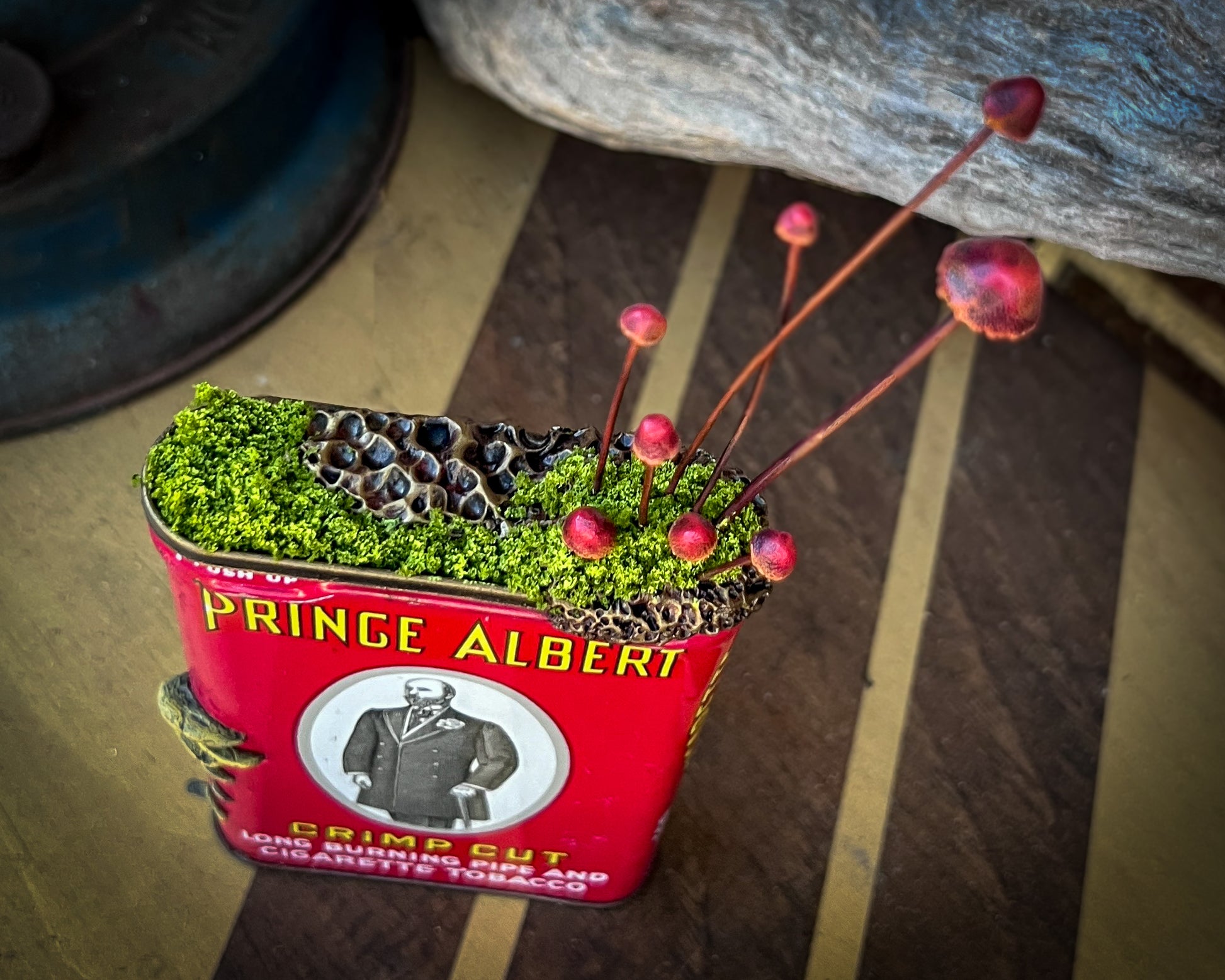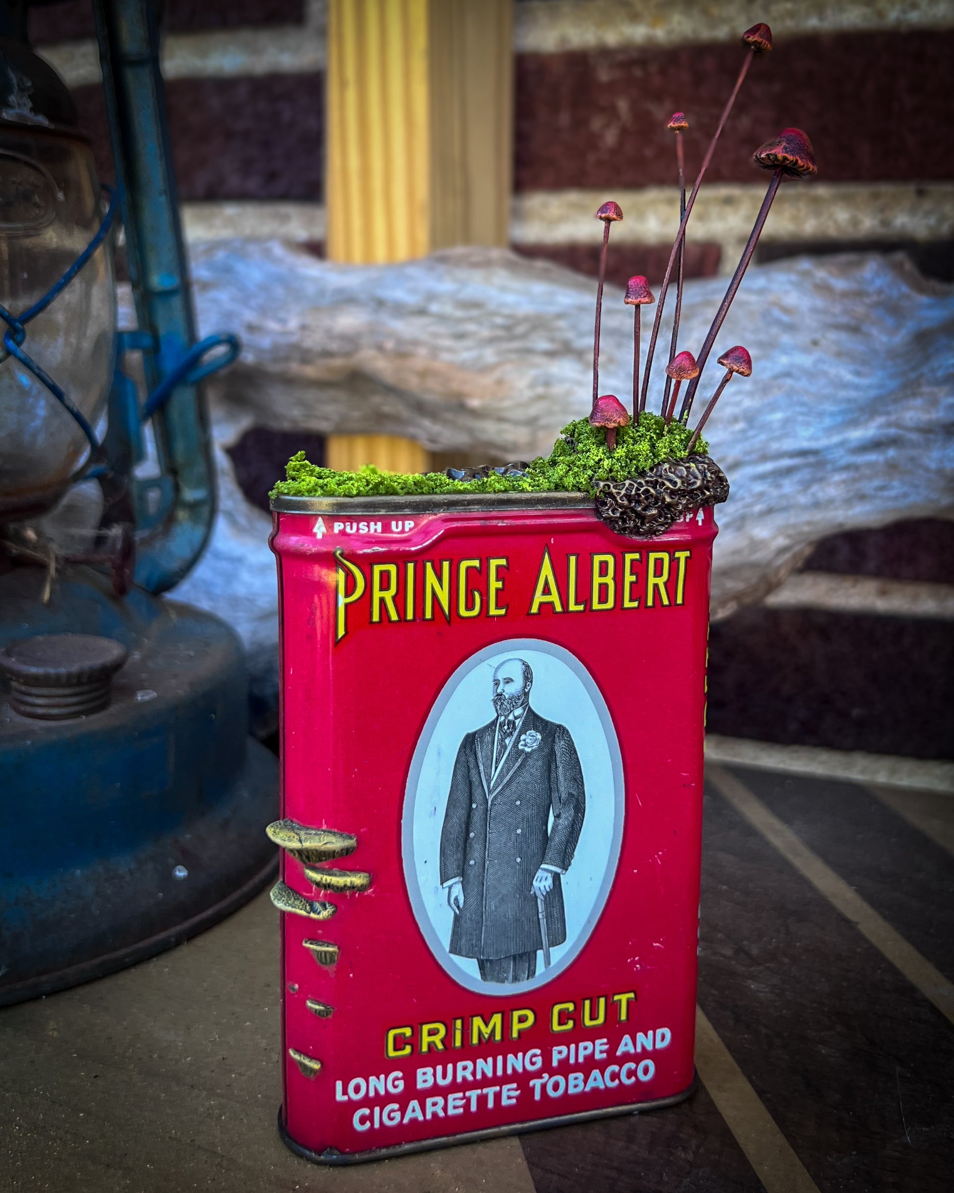 A one-of-a-kind sculpture made from a vintage Prince Albert Crimp Cut tobacco tin. Moss and hand-sculpted mushrooms rise from the worn metal, giving a sense of quiet regrowth and transformation.
