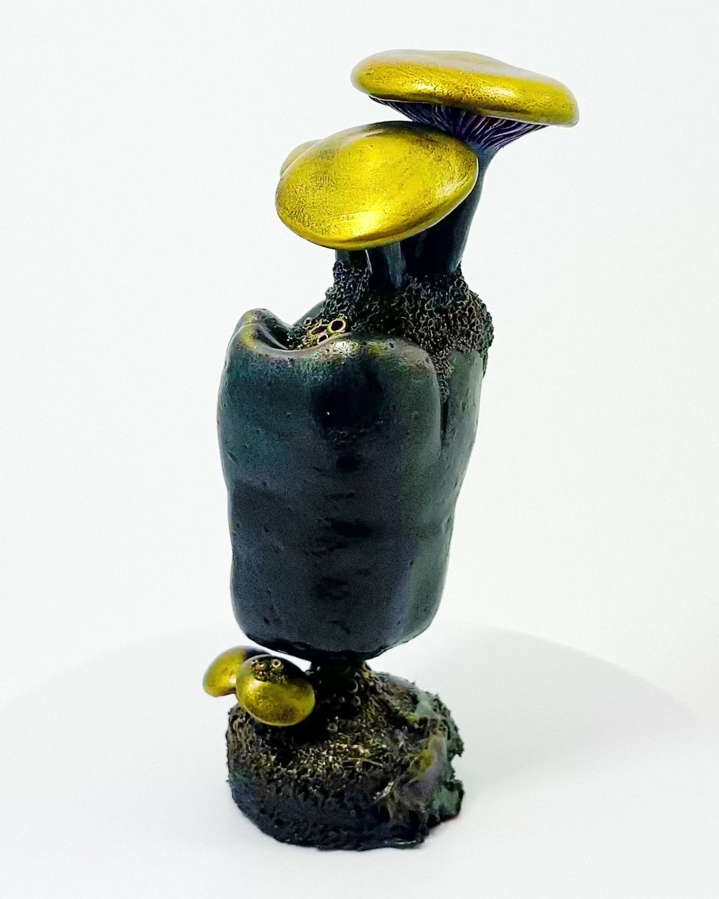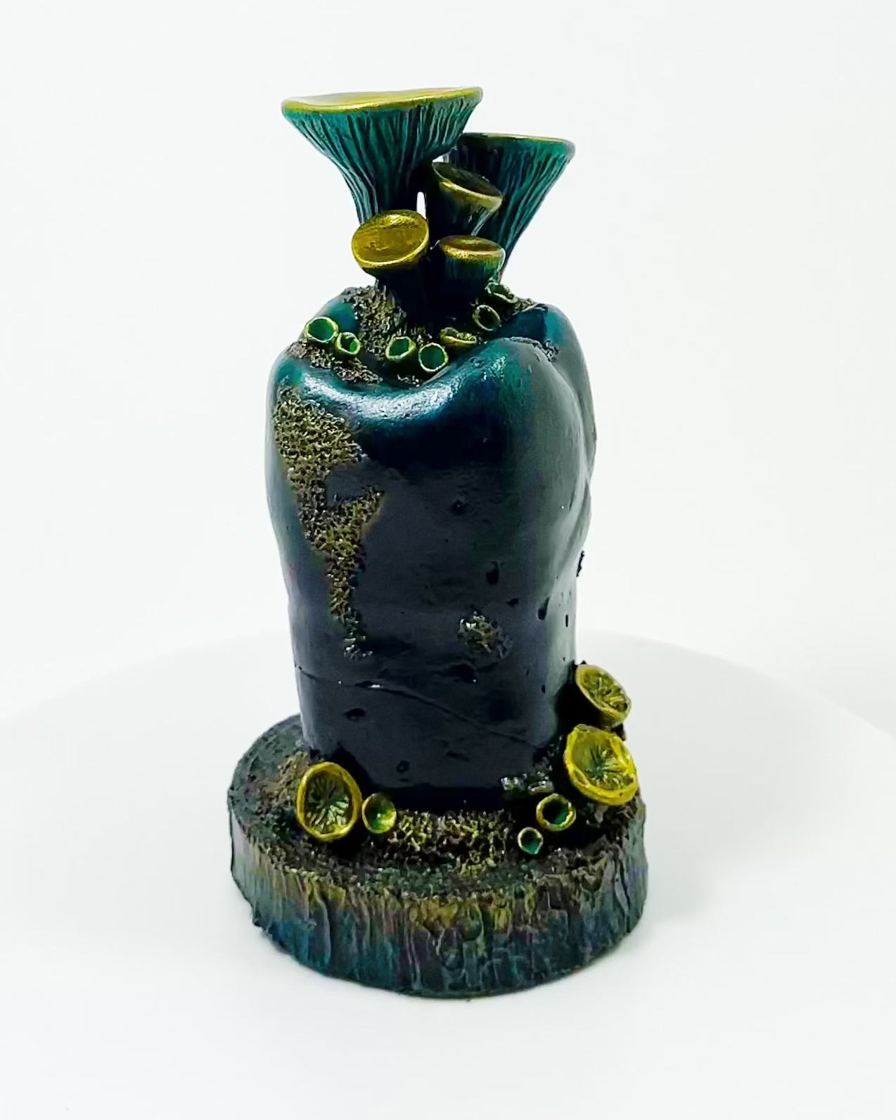 These fungi-covered tooth sculptures began as real vintage dental model teeth, found inside an old dentist’s cabinet. Once used as teaching tools, these oversized teeth have now been transformed into surreal organic specimens as part of my Metallic Spores series.
