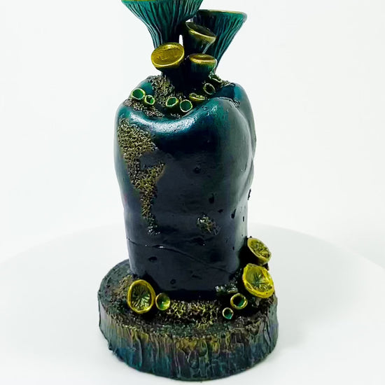 A charcoal tooth with teal mushroom caps, gold spores, and ringed fungi formations. Displayed under a clear cloche dome.