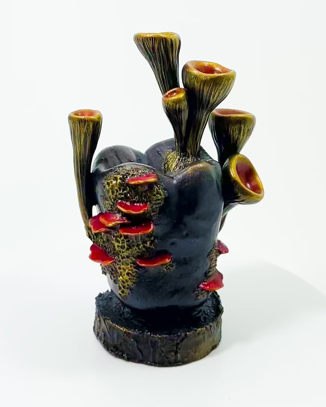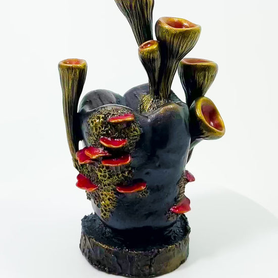 Warm golden trumpet caps and vivid red fungal formations growing up the side. Includes matching cloche dome.