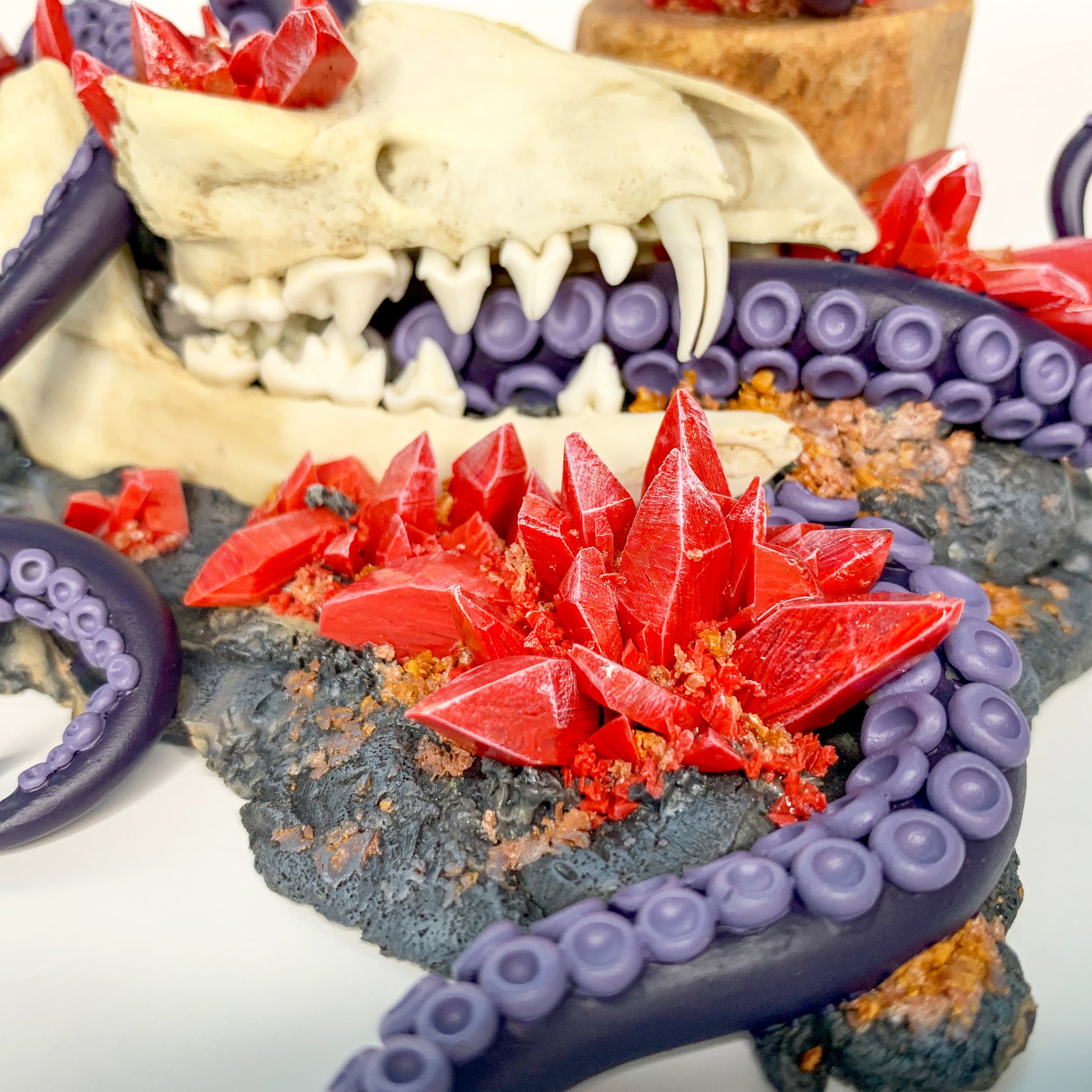 ✦ Materials: Found animal skull, hand-sculpted clay tentacles & crystals, reclaimed bone, mixed media